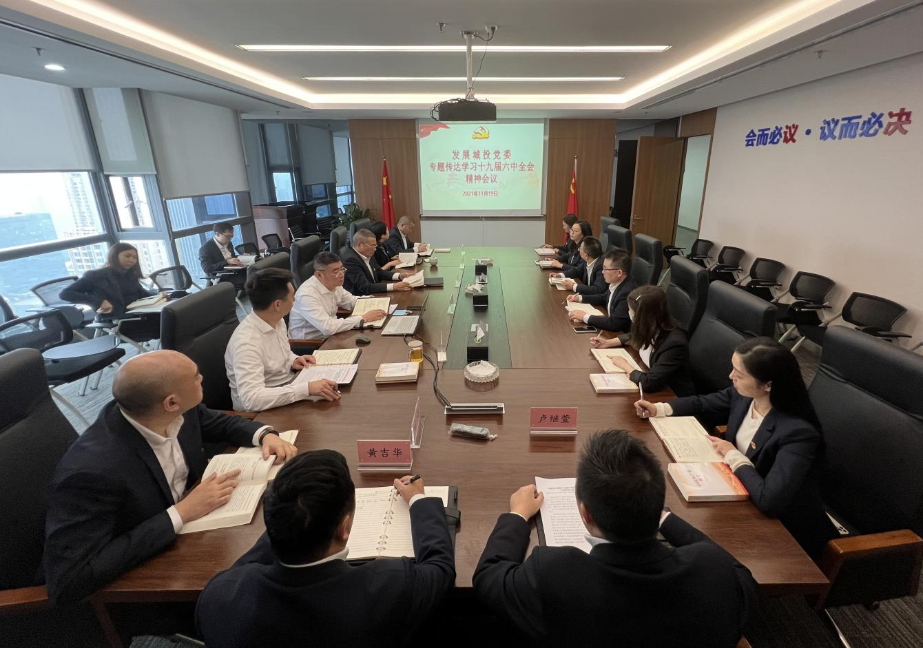 11月19日,发展城投党委在公司会议室组织召开2021年度第六次理论学习中心组(扩大)会议,专题学习十九届六中全会精神,旨在将六中全会精神融入到工作中,推动公司高质量发展。